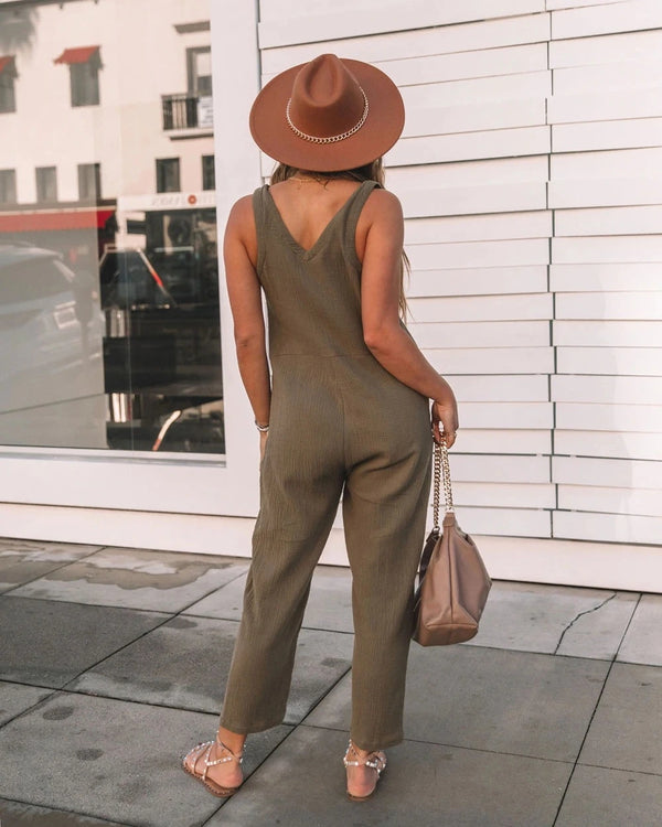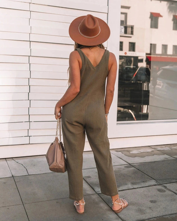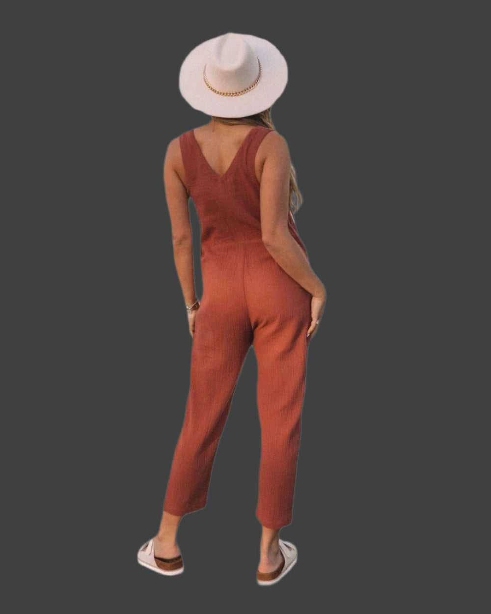 Dieser ärmellose Jumpsuit mit tiefem V-Ausschnitt kombiniert schlichte Eleganz mit modernem Komfort. Die lockere Passform und das leichte Material machen ihn ideal für warme Tage und vielseitige Freizeitlooks. Perfekt für Reisen, Stadtbummel oder entspannte Sommerabende.
