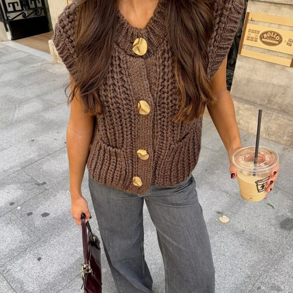 Diese charmante Strickweste mit goldfarbenen Knöpfen ist ein echtes Highlight für Ihren Kleiderschrank. Das grob gestrickte Design und die praktischen Taschen machen sie nicht nur gemütlich, sondern auch funktional. Perfekt als Übergangsteil oder als Layering-Element für modische Looks.