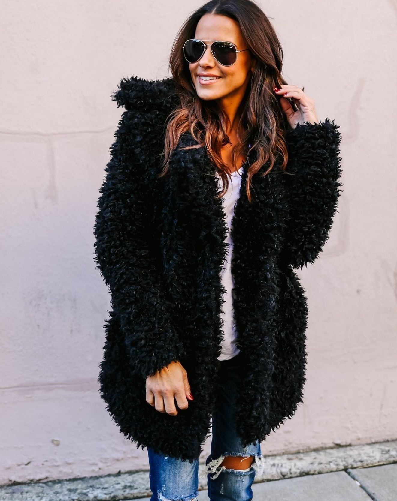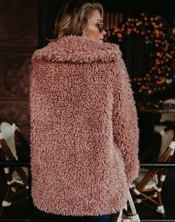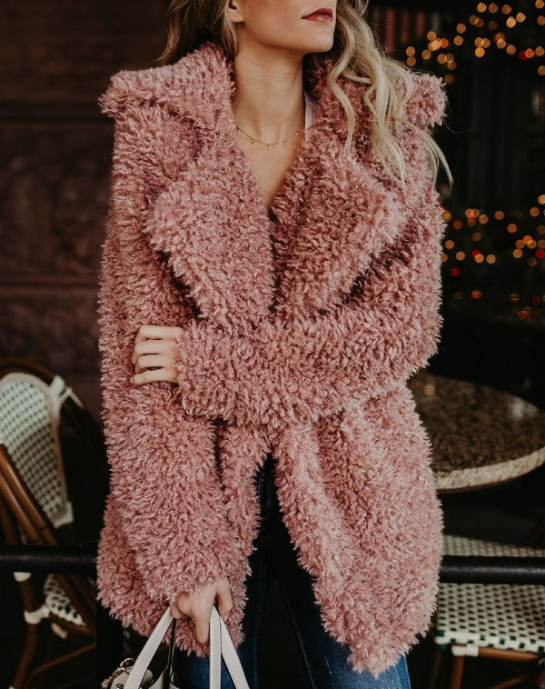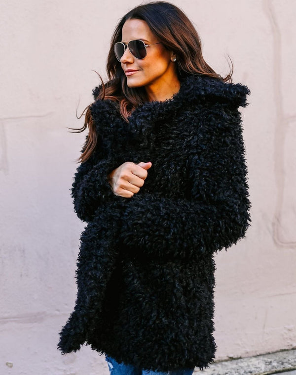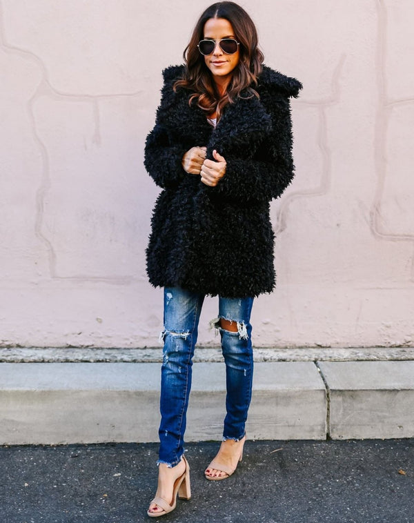 Diese Plüsch-Teddyjacke mit Kapuze bietet maximalen Komfort und einen modernen Look. Das flauschige Material hält Sie an kalten Tagen kuschelig warm, während die Kapuze und der lockere Schnitt für eine lässige, trendige Silhouette sorgen. Ideal für entspannte Freizeit-Looks oder winterliche Ausflüge.