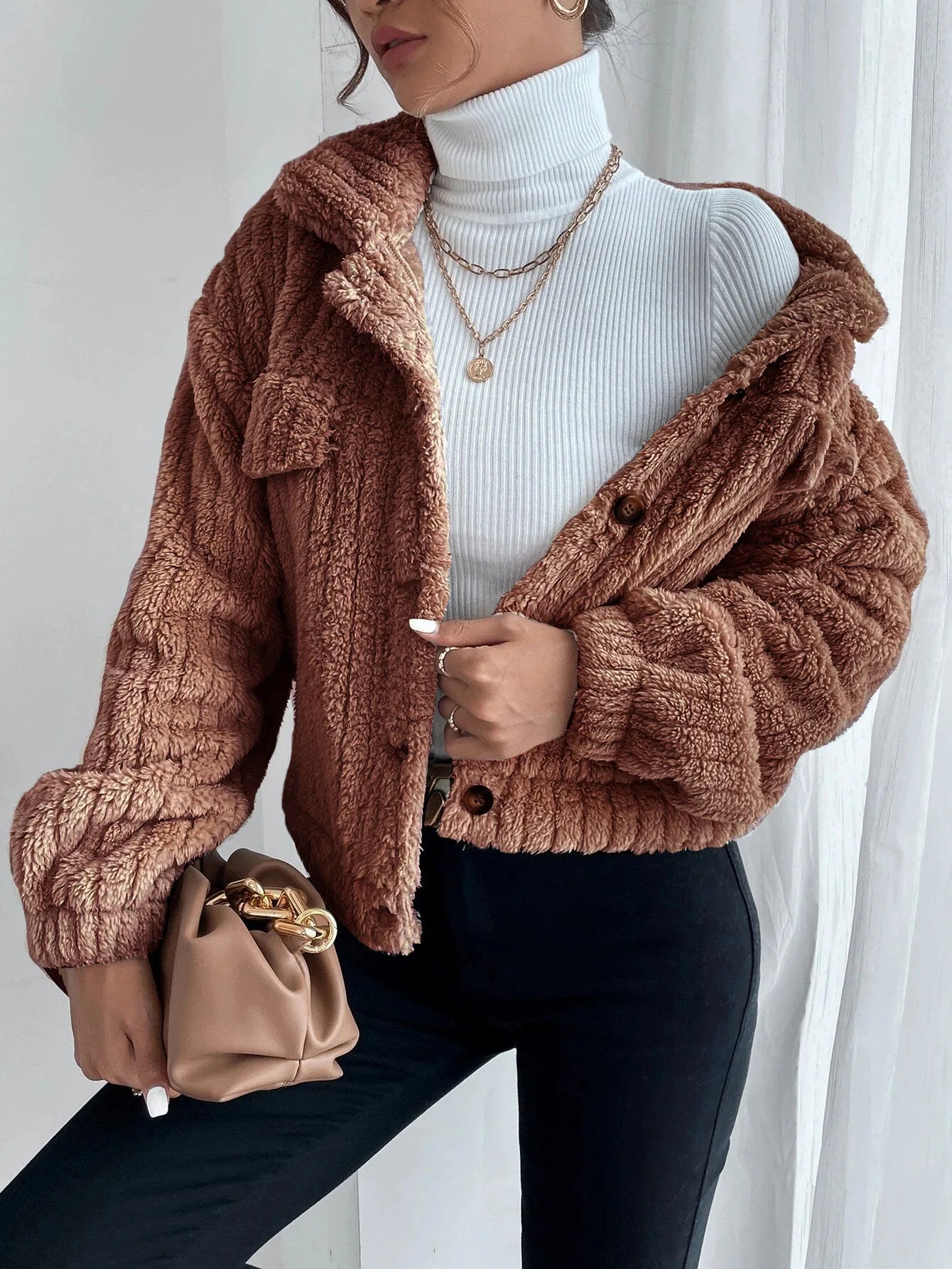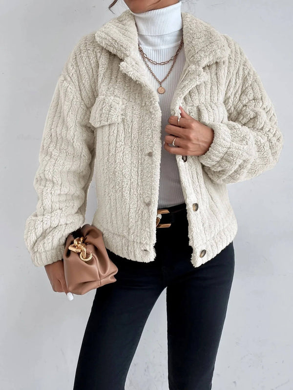 Diese Teddyjacke in kurzer Passform ist der perfekte Begleiter für die kalten Jahreszeiten. Mit ihrer flauschigen Textur und dem modernen Schnitt bietet sie nicht nur wohlige Wärme, sondern auch ein modisches Statement. Die Knopfleiste und die weiche Haptik machen sie ideal für Alltag und Freizeit.