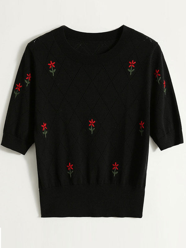 Dieser elegante Strickpullover kombiniert ein raffiniertes Rautenmuster mit floralen Stickereien, die dem Look eine feminine und einzigartige Note verleihen. Mit kurzen Ärmeln und einer bequemen Passform eignet er sich perfekt für wärmere Tage.