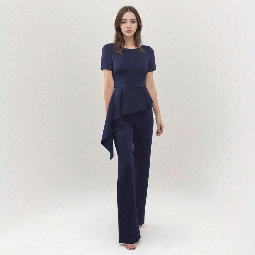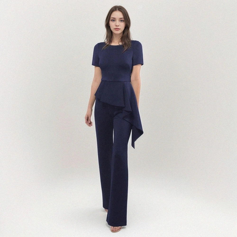 Dieser elegante Jumpsuit mit kurzen Ärmeln und asymmetrischem Taillen-Detail ist die perfekte Wahl für einen anspruchsvollen Look. Das fließende Material und die schlichte Silhouette betonen die Figur und sorgen für eine moderne Eleganz. Ideal für Hochzeiten, Dinner oder formelle Anlässe.